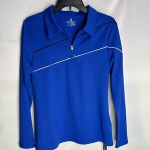 Stylish blue long sleeve polo shirt with zip-up collar. Features black and white stripe accents.