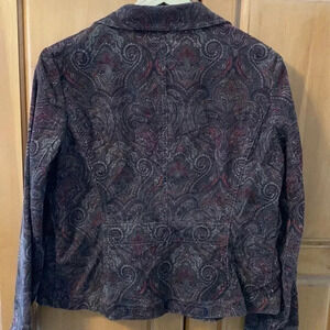 Awesome jacket! Brown with dark paisley pattern. Stretch. Aged brass buttons. Corduroy fabric. Gently worn and has character. Size Petite Medium.