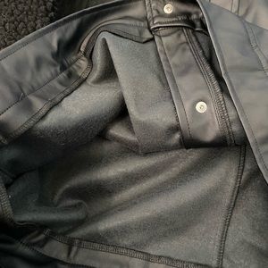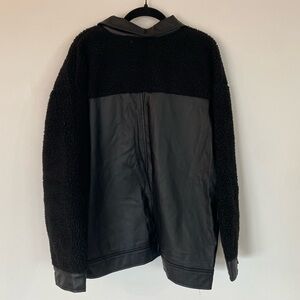 Stylish black leather jacket. Features textured sleeves. Button-up front with pockets.