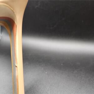 Brand new in box. Does have a slight try on wear, and there is a small flaw in one of the heels (shown in pic). It's not noticeable, but I did want to point it out.