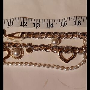 Elegant multi-layered charm belt from Lovers + Friends. It features gold-tone and silver-tone chains adorned with faux pearls and heart charms, a style often designed to symbolize friendship. perfect for any occasion.