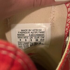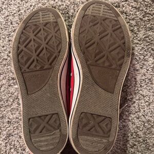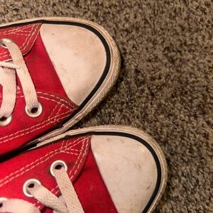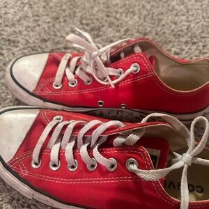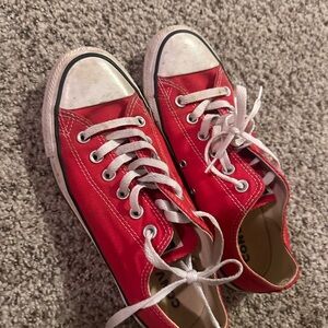 Stylish and comfortable red canvas Converse. Durable design with classic lace-up closure. Still in good condition with lots of life, just a little dirty but can be cleaned. Good sole. I WILL wipe down white part of shoe to clean it up once sold.