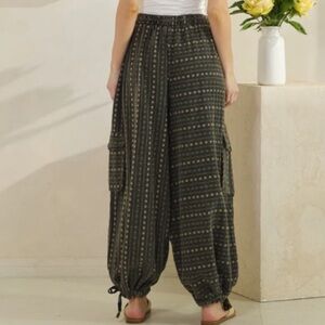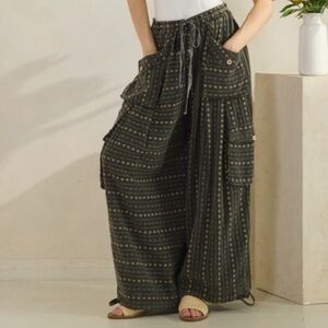 Stylish cargo pants with a drawstring waist. Features multiple pockets. Comfortable and trendy design. The string to the pants broke; it’s been attached by tying it back together. Otherwise they are like new.