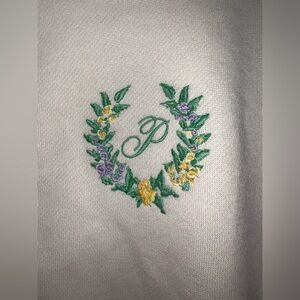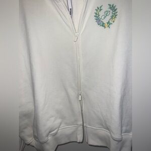 Beautiful, clean white zip-front jacket featuring a delicate floral embroidered wreath with “P” monogram on the chest. Lightweight and comfortable — NOT fleece lined, making it perfect for layering year-round.