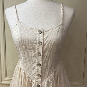 Adjustable braided straps, lined skirt, pockets and it ties in the back.