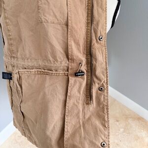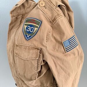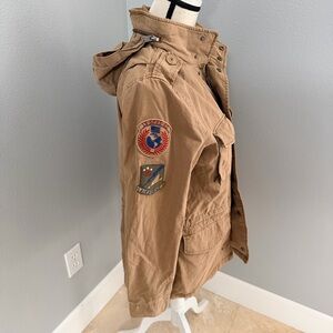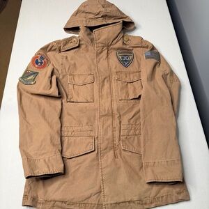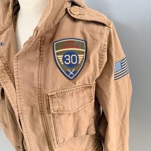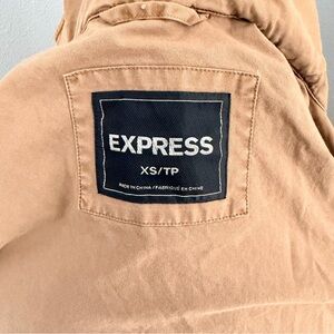Express military field jacket in a tan or khaki color. The design features multiple military-inspired patches, a full zip closure with snap buttons, and four front pockets.