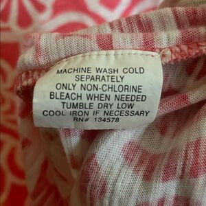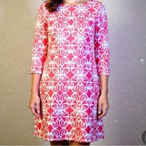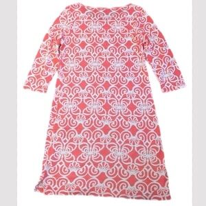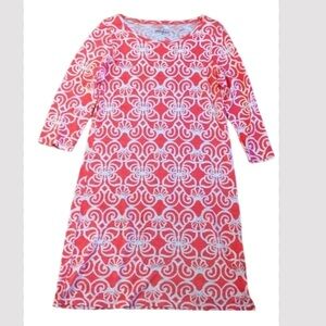 This Vineyard Vines T-Shirt Dress in size S features a coral and white abstract print with a boat neck and 3/4 fitted sleeves.