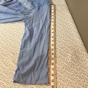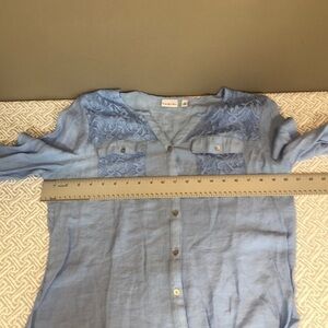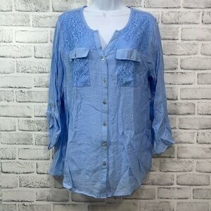Light blue, lace detailing, button up, thin buttons, roll tab sleeves, Colors may vary due to lighting, EUC, size: XL