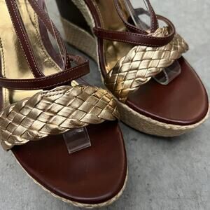 Audrey Brooke Women's 9.5 Shakes Brown Gold Weave Espadrille Platform Wedge Sandals