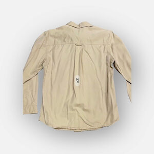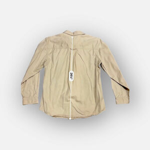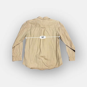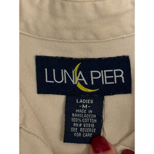 This pre-owned vintage early to mid 1990s Luna Pier women's long-sleeve button-down shirt, size Medium, is crafted from 100% beige tan cotton. The front features a patriotic design including a doll figure with a "Born in the U.S.A." sign, "Real Friends are..." text, red and blue stars on the chest pocket, and "Red, White, and True!" text. It has a collar and buttoned cuffs. Visible signs of wear include faint discoloration near the doll design. Please see picture for measurements. Overall great vintage condition