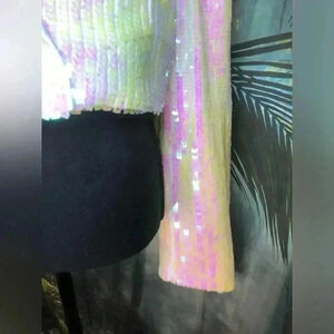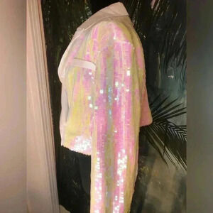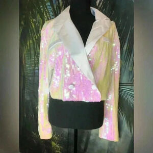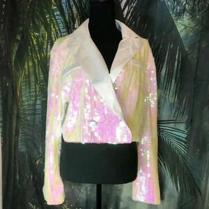 Bachelorette party or bridal shower in your future? This cropped tuxedo blazer is a must. After all, you're not a regular bride-to-be, you're a COOL bride-to-be. Decked out in pearlescent sequins, this tailored statement-maker brings the shine to any dressed-up affair. Wear it buttoned as a top and pair with high-waisted trousers for a modern look.