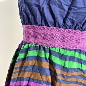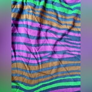 Adjustable straps. Elastic waist. Wavy colorful animal print on bottom.