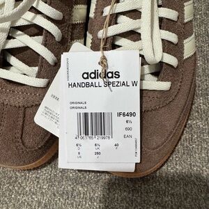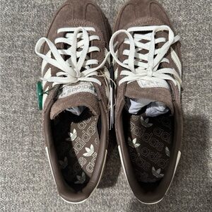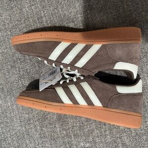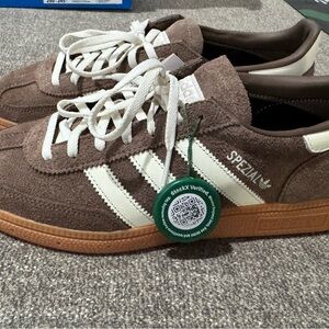 Brand new. Unworn. Needed a smaller size. Classic Adidas Spezial sneakers. Rich brown suede with white stripes. Comfortable and stylish.