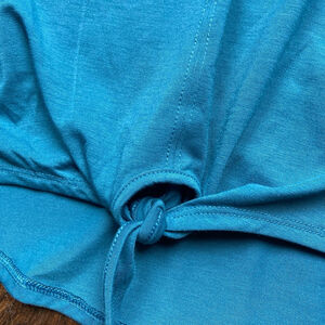 This is a pre-owned Athletic Works long-sleeved shirt, size M (7-8). The shirt is teal and features a crew neck and a tie at the bottom. It is made of 96% polyester and 4% spandex. The shirt has a logo on the left sleeve. There are no visible stains, tears, or other imperfections. The shirt is in good condition.