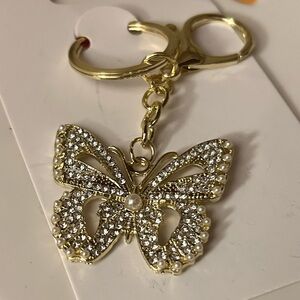 New Gold-Tone Butterfly Charm, Clear Sparkling Rhinestones, Faux (middle) Pearl. Key Ring with Lobster Clasp, Use on your Bag, Backpack, or as a Keychain, New, Never used.