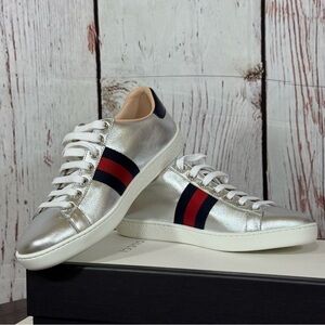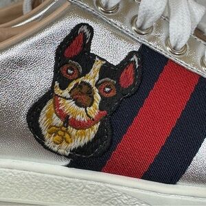 GUCCI ACE “Year of the Dog” metallic silver sneakers.