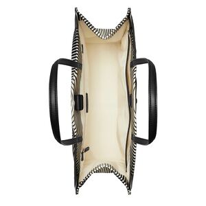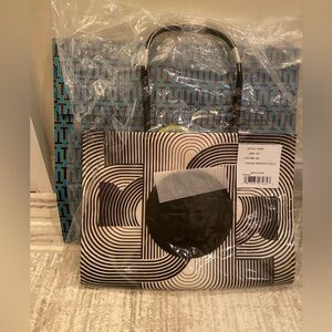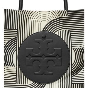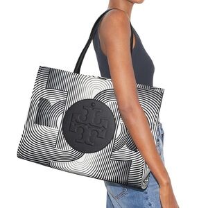Chic tote with bold geometric patterns. Features iconic logo detail. Ideal for versatile styling.