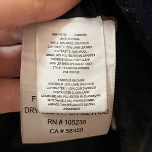 Navy blue moto jacket. XS. Faux fur collar. 100% lamb leather and 100% wool accents. Zip closure. Belted waist. Excellent condition aside from one small spot on the collar as pictured.