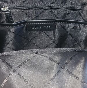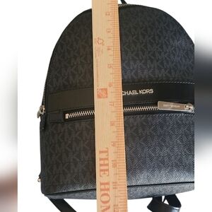 Elegant Michael Kors backpack with monogram design. Features sleek black accents. Ideal for daily use.