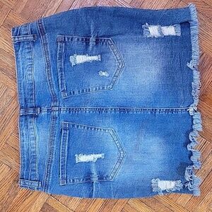 Trendy distressed denim mini skirt with frayed hem. Perfect for casual outings.