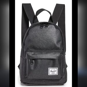 Hershel Supply Company Classic Mini Backpack. Coated canvas with glitter finish, logo patch, two way zipper closure, zip exterior pocket, adjustable shoulder straps, signature stripes lining.