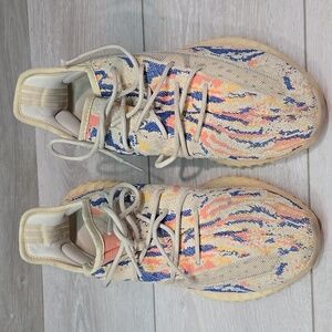 Stylish multicolor knit sneakers with a unique design. Features a blend of beige, blue, and orange hues.