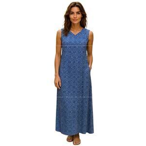 Chic sleeveless maxi dress with intricate blue and white pattern. Perfect for casual outings or special events.