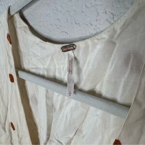 Romantic and playful Free People Date Night Mini Dress in a soft cream-white base with yellow and rust polka dots. Features a deep V-neckline, long sleeves with button cuffs, front button detail, and a flattering cinched waist that flows into a flirty mini-length skirt. Lightweight crinkled fabric adds a breezy, boho touch.