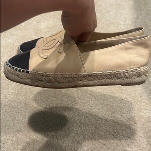 Elegant CHANEL espadrilles with tan leather and black toe cap. Iconic logo detail. Perfect for stylish outings.