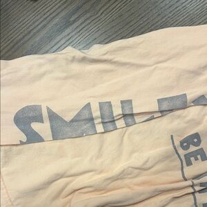 Peach long sleeve tee with playful graphic. Features smiley faces and peace signs. Perfect for casual outings.