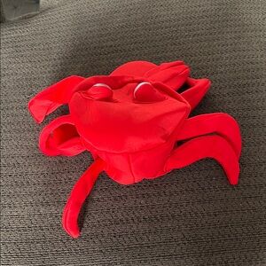 This is a whimsical red plush hat designed to resemble a crab, complete with googly eyes and multiple plush legs. The hat is likely intended for costume or novelty use, providing a fun and playful accessory.