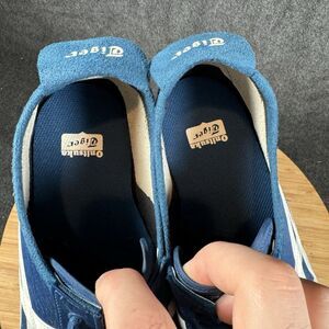 Navy Onitsuka Tiger sneakers with white stripes. Sleek and sporty design.