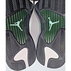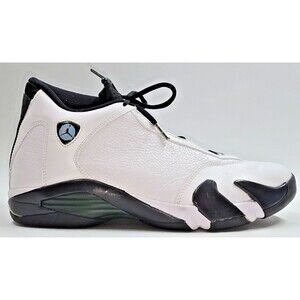 The size 12 Air Jordan 14 Retro 2016 Oxidized Green 487471-106 sneaker is a stylish and comfortable option for men who appreciate activewear and athletic footwear. Made with a leather upper and featuring a rubber outsole, this high-top silhouette is perfect for basketball and other activities. The sneaker showcases the iconic Air Jordan logo and design elements from the 2016 release, making it a desirable choice for retro-themed outfits. With a classic color scheme of white and black, this shoe is versatile enough to be worn in any season. There is sock fuzz inside of the shoe.