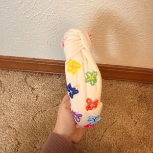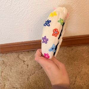 Charming headband with colorful floral embroidery. Perfect for adding a playful touch to any outfit. Has a little dirty spot, but I’m sure you could spot clean it. Never worn, I just could never find anything to wear it with🥲