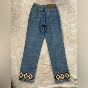 Stylish straight leg jeans. Features unique geometric embroidery at the hem. Ideal for everyday style.