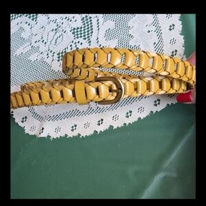This yellow/gold belt In faux leather will add a pop of color to your outfit. The belt is able to be adjusted to fit a variety of sizes. Total length of the belt is approx. 41.5" . With the ability to buckle this at almost any length you can wear this with many styles. In excellent never used condition. FINAL PRICE