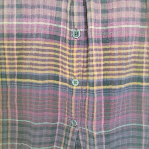 Stylish plaid button-up shirt with a mix of purple, orange, and black colors. Features two chest pockets. 100% cotton has a puckered muslin textured feel to it. 3 button detail in the back. Preloved condition. All sections of interest as well any known flaws have been documented in the photos and noted as thoroughly as possible. if there are no known flaws, none will be noted. Please feel free to ask any questions before purchase 🙂.