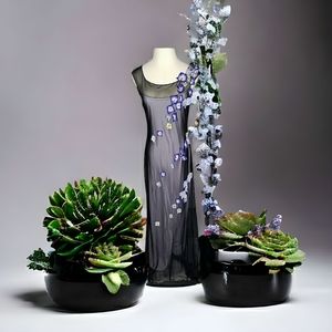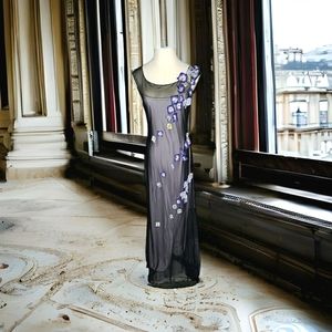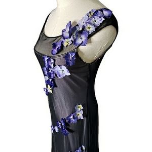 Tadashi Soji Vintage 90's Y2K Mesh Applique 3D Pansies Column sheath Whimsygoth Fairy Maxi dress