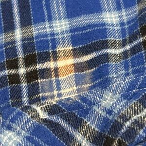 Wrangler men’s long sleeve pearl snap shirt in a classic blue plaid cotton flannel. Features western-style yokes, dual chest pockets, and full pearl snap front closure. Medium-weight cotton with a soft, broken-in feel. One small lightened area from bleach is present on the chest as shown in photos; fabric remains intact with no thinning. Otherwise clean and wearable.