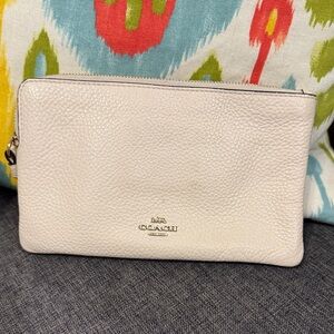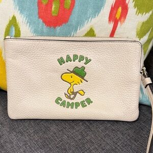Coach chalk color Peanuts Woodstock NET Charming Coach wristlet. Cream leather with playful graphic. Features wrist strap for easy carrying. HAPPY CAMPER Measures 8” by 5”