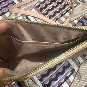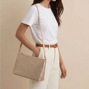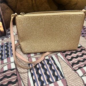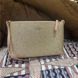 Kate Spade Joeley glitter crossbody bag in a gold or rose gold color with a light pink strap. Perfect for day or night.