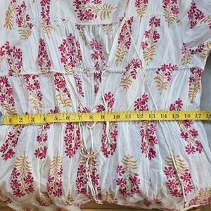 White tunic beach cover up top with red and yellow floral print. Lightweight and stylish. 3 ties. Waist and chest both have elastic, so there is some give!