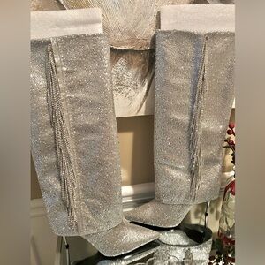 These beautiful stiletto rhinestone boots pull on.