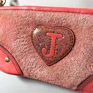 The outside is Pink with a White embroidered crown and Juicy spell out in a script font. J heart on the back with a custom glitter rework. Gold hardware.