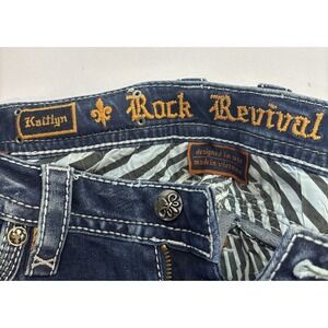 The Rock Revival Kaitlyn Boot Cut Embellished Jeans in size 27 (28) feature a low rise design with rhinestone accents, giving them a stylish and unique look. Made of a denim fabric blend with added stretch, these jeans are comfortable to wear and perfect for all seasons. The bootcut style and 5-pocket design add a trendy touch to the classic blue color, making them a versatile wardrobe staple for any fashion-forward woman.