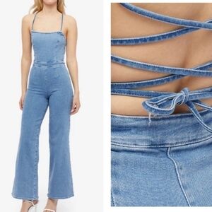 Good American Vacay Blue Denim Sleeveless Tie Back Flare Leg Jumpsuit Sz 2
