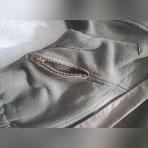 Chic green cropped blazer with unique stitching. Features zippered sleeves and gathered waist. Perfect for layering.