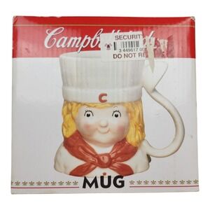 Campbell Kids chef character ceramic mug designed by Benjamin & Medwin. This charming mug features the iconic Campbell Kids character dressed as a chef with a red scarf and chef hat complete with a 'C' emblem. Its whimsical design makes it a delightful addition to any kitchen or a perfect gift for collectors. Ideal for enjoying your morning coffee or soup.