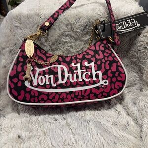 Stylish Von Dutch cap with a cream top and vibrant orange brim. Iconic logo on the front.