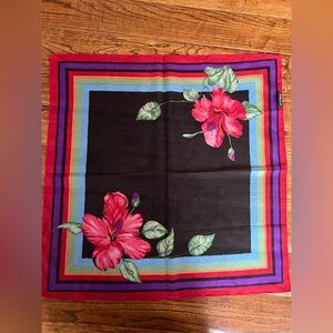 This is a vintage Cejon scarf with a striking floral design featuring red hibiscus flowers on the black background. Its borders include red, orange, purple, blue and green stripes. The scarf is sheer and lightweight. The size of a bandana, it can be used as headgear, a hair accessory, a belt or a purse decoration.